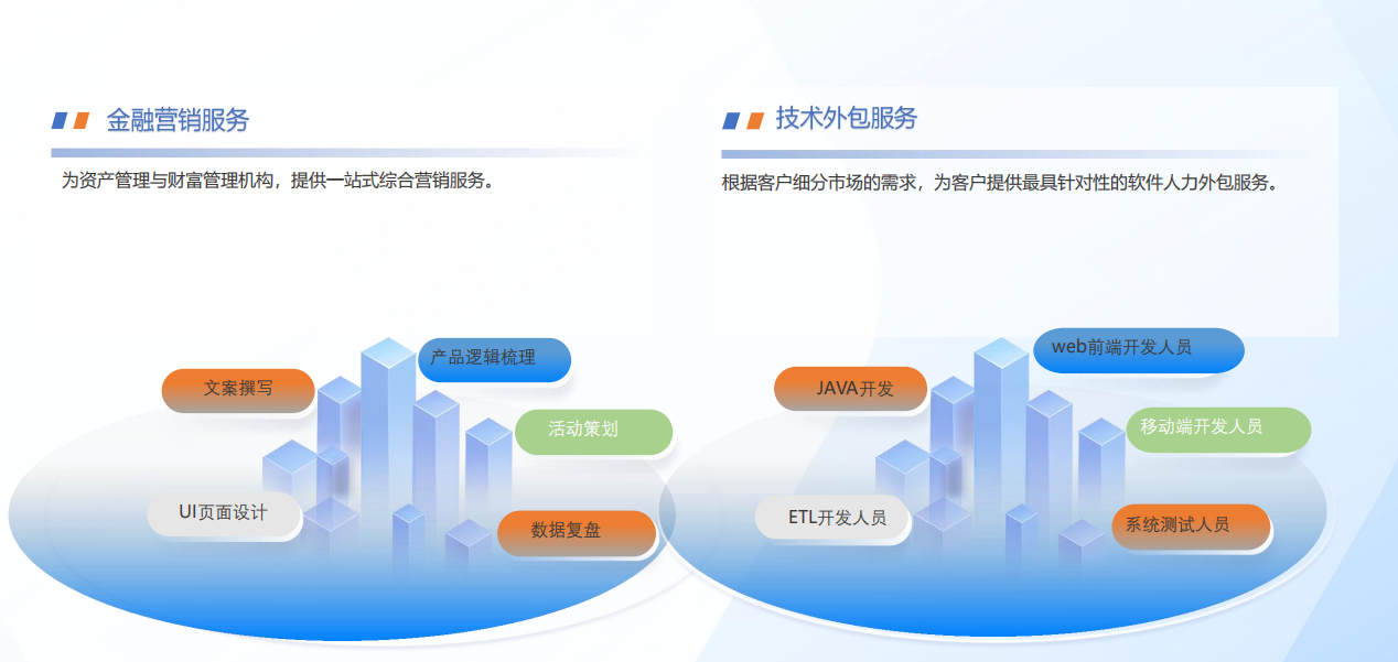 外包駐場(chǎng)服務(wù)?: 提供金融IT技術(shù)人力外包及營(yíng)銷(xiāo)運(yùn)營(yíng)支持,涵蓋開(kāi)發(fā)、測(cè)試、設(shè)計(jì)等領(lǐng)域。